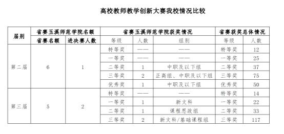参赛教师们认真准备,精心打磨,经网络初评和现场决赛两个环节,我校胡晓东获新文科组一等奖、阳利永获课程思政组二等奖、尹娟获新文科组三等奖、曾艳萍获基础课程组三等奖。与上届创新大赛相比,我校进决赛的人数比例从 16.7% 增至 40%、获奖人数比例从 66.7 增至 80%,获奖等级有明显提高。详情见下表: