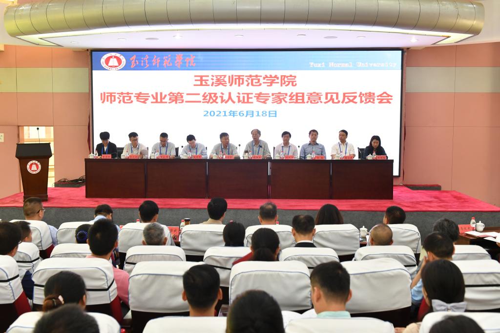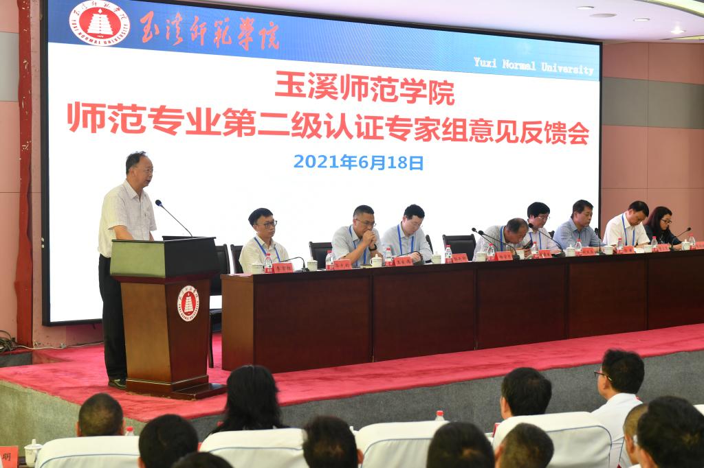 6月18日,联合认证专家组在图书馆多元学术厅主持召开专家组意见反馈会。专家组全体成员,省教育厅副厅长王永全,省教育评估院院长方贵荣,玉溪市教育体育局局长张绍东,省教育评估院副院长司慧迎,玉溪师范学院全体校领导、职能部门负责人,体育学院、数学与信息技术学院领导班子、专业负责人及全体教师,玉溪师范学院其他师范类专业所在学院院长、书记、副书记、专业负责人、教务处全体人员参加会议。