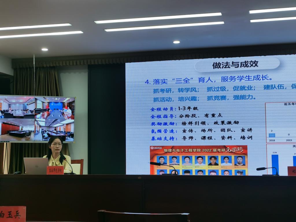 2022年6月27-28日,云南省教育评估院召开高校本科专业综合评价学科组专业建设专题研讨会,玉溪师范学院副校长章新、二级学院院长、分管教学副院长、专业负责人、教学督导团成员、教务处、质评中心相关人员参加了视频会议。物理与电子工程学院副院长杨春艳参加了现场会议,并作经验交流汇报。