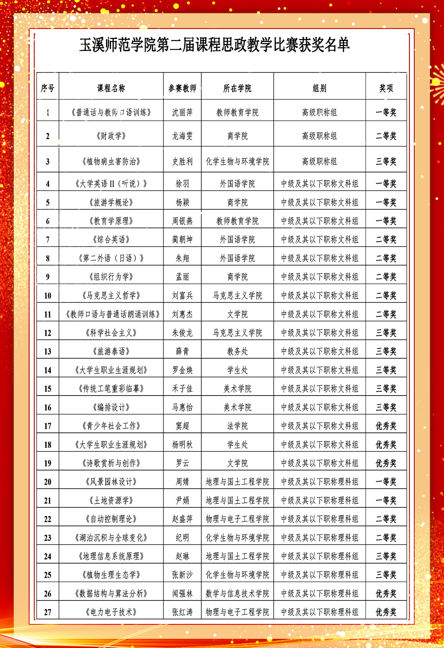本次比赛较上届不同的是,增加了各学院的初赛遴选环节,推选出了13个学院的30名教师参加决赛,参赛教师按职称和学科分组进行,高职组及中级及以下职称组比赛规则不同,比赛时长上也有差异,评委组特别增加了学生评委团。参赛教师通过教学设计、课堂教学、说课、课程思政建设成效介绍四个环节进行比赛,由评委组根据评分标准,对参赛教师进行全方位评价。经过两天的比赛,高级职称组、中级及其以下职称文科组、中级及其以下职称理科组三个组别共评出27个奖项,其中,一等奖6项,二等奖8项,三等奖8项,优秀奖5项,第二届课程思政教学比赛圆满落下帷幕。