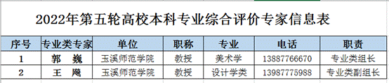 3、本轮专业综合评价我校有郭巍、王飚两位教授入选评价专家(见2022年第五轮高校本科专业综合评价玉溪师范学院专家信息表),请两位专家按时组织或参加专业类评价(见流程第三步)。