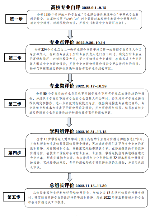 2022年第五轮高校本科专业综合评价专业自评和材料提交阶段的工作已于2022年9月16日结束。云南省教育评估院于2022年9月20日发布了《2022年第五轮高校本科专业综合评价工作手册》和《云南省教育评估院关于成立2022年高校本科专业综合评价专家组的通知》,安排部署2022年9月20日-11月30日这一阶段的专业综合评价工作,工作流程和进度要求如下图: