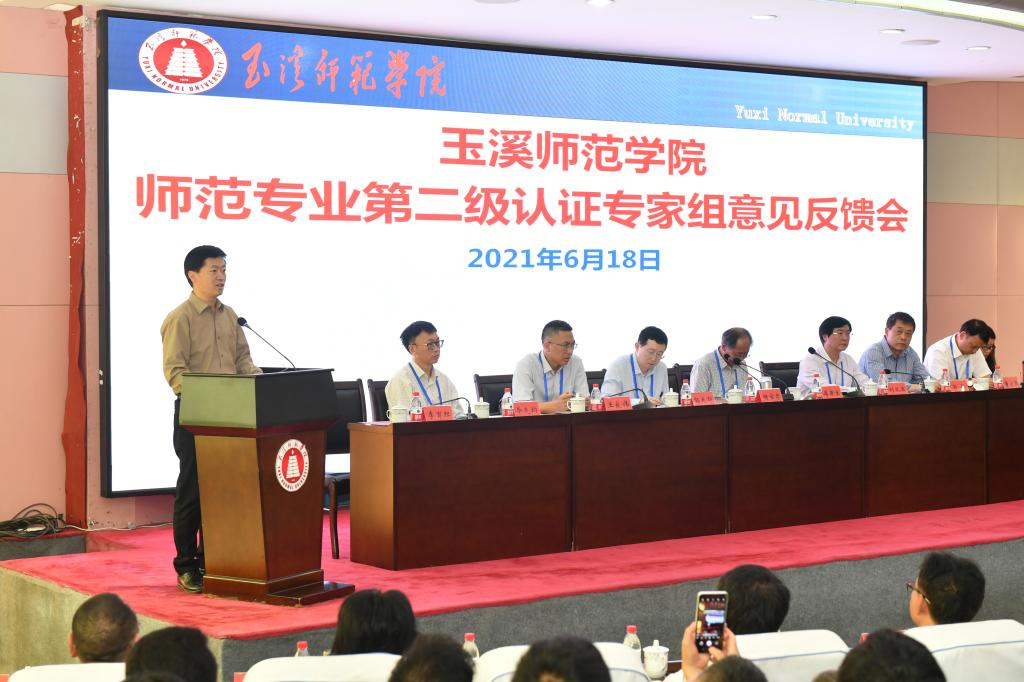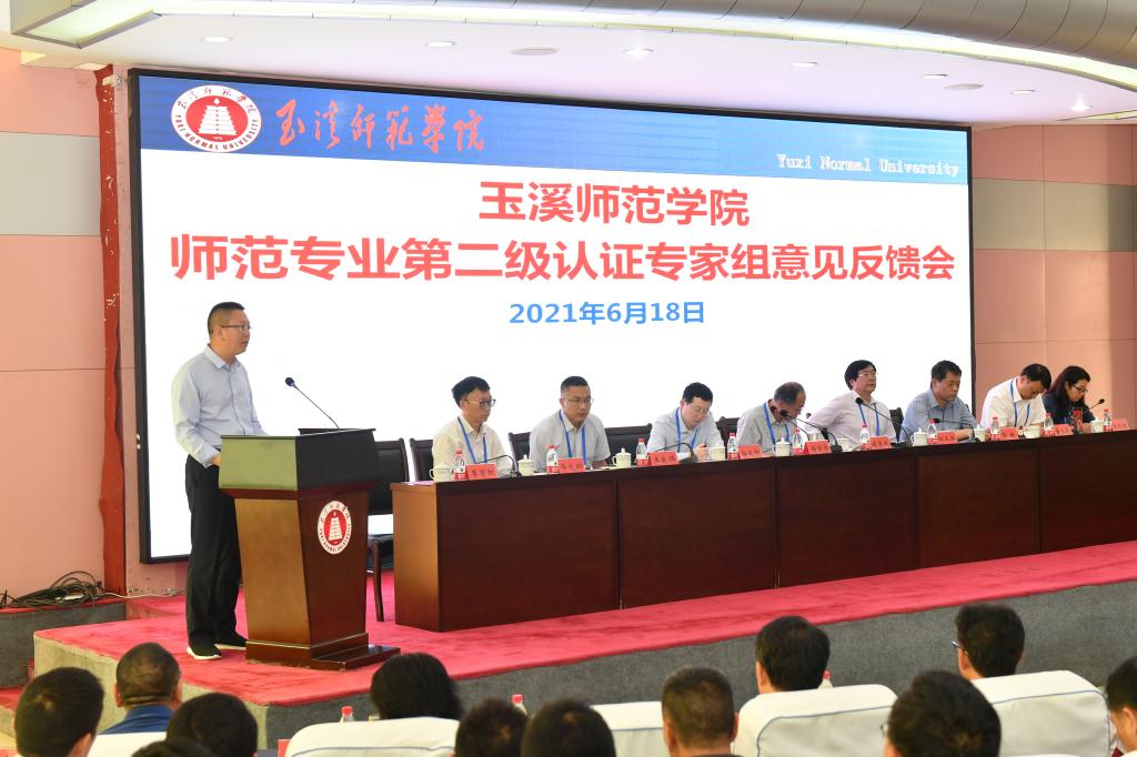 6月18日,联合认证专家组在图书馆多元学术厅主持召开专家组意见反馈会。专家组全体成员,省教育厅副厅长王永全,省教育评估院院长方贵荣,玉溪市教育体育局局长张绍东,省教育评估院副院长司慧迎,玉溪师范学院全体校领导、职能部门负责人,体育学院、数学与信息技术学院领导班子、专业负责人及全体教师,玉溪师范学院其他师范类专业所在学院院长、书记、副书记、专业负责人、教务处全体人员参加会议。
