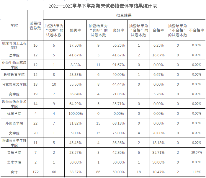 被抽查的172本试卷中,评审结果为“优秀”的有66本,优秀率为38.37%;评审结果为“良好”的有86本,良好率为50%;评审结果为“合格”的有18本,合格率为10.47%;评为“不合格”的2本,不合格率为1.16%。