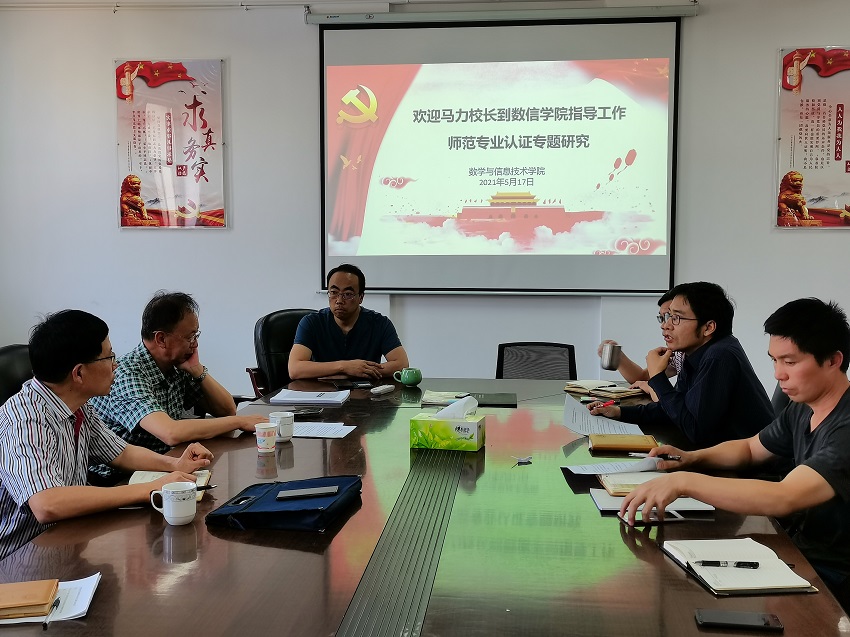2021年5月17日下午,校长马力、副校长章新,教务处处长安镇宙一行到数信学院看望慰问2021年师范类专业认证工作一线教师,调研指导数学与应用数学师范类专业认证工作,参加了数信学院召开的师范专业认证专题研究座谈会。数学与信息技术学院党政相关领导,专业负责人,师范类专业认证相关教师参加了座谈会。